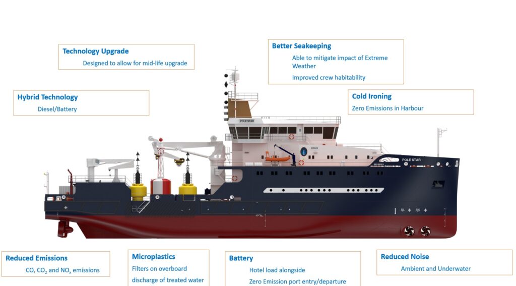The new vessel is a step change from what has gone before using new technology to minimise the impact on the environment. The ship has enhanced capability to help deal with the effects of climate change, and will contribute to the ambitious environmental targets set out in the UK Government Clean Maritime Plan.