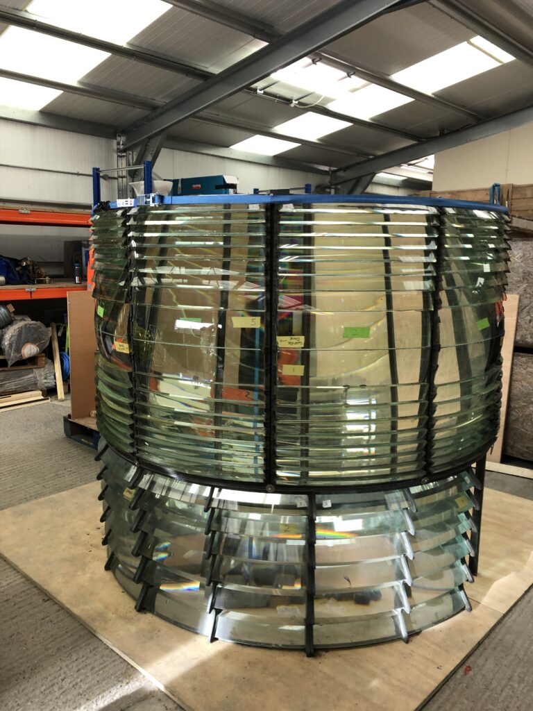 The second task was to build the optic in the depot to ensure all the parts were available and check there was no damage that would stop the optic from being reassembled.  This work was completed early in the summer of 2024 with all optic parts located, identified and assembled.  There were two main areas of concern: there was a chance that the putty holding the glass prisms in place could potentially contain asbestos, the other concern is the putty  drying out such that these prisms were no longer held tightly in place.  Further testing revealed no asbestos in the putty enabling further work that will see the optic fully refurbished before installation.