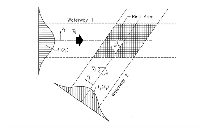 • collisions when two routes cross each other, merge, or intersect each other in a bend of a fairway.