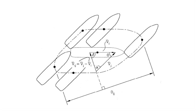As mentioned Dij is the geometrical collision diameter illustrated in Figure 4. If it is assumed that the ships can be approximated by rectangular shapes, then it can be shown, see Figure 5, that: