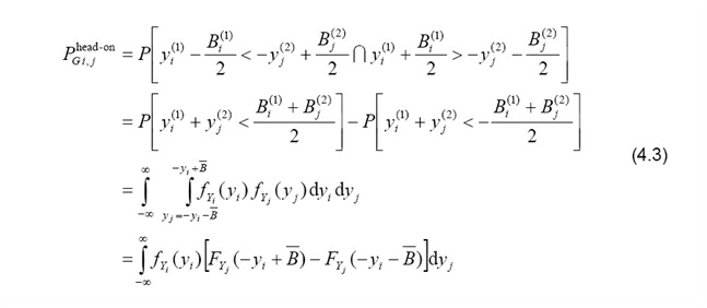 It is noted that the random variable Yj(2) is negative because of the positive sign convention in the sailing direction of the two vessels. In the last step it has been utilized that the two distributions are independent. It is possible to establish a closed form solution to Eq. (4.3) when the traffic distributions are normally distributed. In the general case Eq. (4.3) must in be solved by approximate procedures such as FORM/SORM or numerical integration. When fi(1)(y) and fj(2)(y) both follow a normal distribution with distribution parameters (μi ,σi) and (μj ,σj), respectively, eq. (4.3) can be written as:
