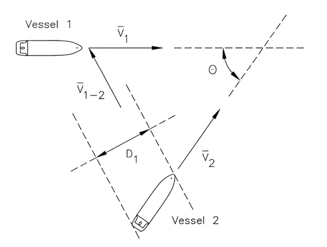 In the present work we are not only interested in the number of ship-ship collisions but also in the probability of the one or the other being the struck or striking vessel. To derive a simple expression for this event the apparent collision diameter is formulated, see Figure 6. The apparent collision diameter seen from vessel i , Di(1), can be determined as: