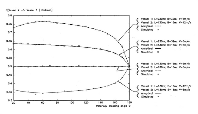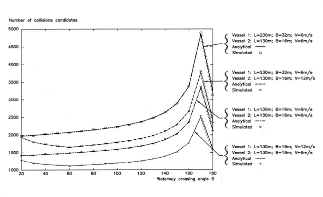 Figure 8 shows the number of collision candidates during a period of forty years determined by time simulation and determined by the analytical expression Eq. (4.6) as functions of the angle θ between the two waterways.