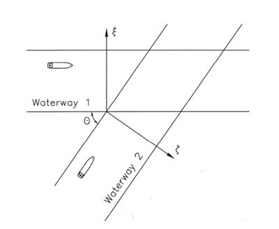 What has been considered is vessels of the same type in waterway 1 crossing the axis ξ, see Figure 7, as points in a Poisson process with intensity Q1 = 20000 vessels per year. The vessels in waterway 1 are assumed normally distributed over the width of the channel with μ = 100 m and σ = 45 m. Similar assumptions are made for vessels in waterway 2 crossing the axis ζ in Figure 7. Here Q2 = 50000 vessels per year and μ = 100 m and σ = 45 m. The vessels in the two waterways are moving with speed V1 and V2, respectively.