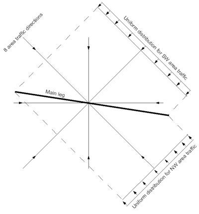 To account for traffic not following the defined legs, area collision calculation is carried out. Area traffic sails randomly. To model this, 8 area traffic legs are defined for each main leg. These 8 area traffic legs then intersects the main leg. The directions are N, NE, E, SE,S,SW,W and NW. Depending on how the legs intersects the main leg, either crossing or head-on collision is calculated. The lateral distribution of the area traffic is uniform, and the lower and upper boundary is such that the area traffic can intersect the main leg in its entire length. In case of head-on collision the lower and upper bound is set according to the main leg's lateral distribution. The number of area ships are given by the user as an intensity [ships crossing the main legs pr. year].